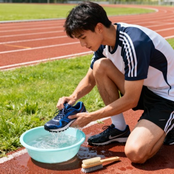 广角镜头,雨后清晨的中学校园,湿润的红色塑胶跑道在朝阳下泛着珍珠般的光泽,跑道线被雨水冲刷得格外洁白醒目,跑道两侧的青草叶尖垂着晶莹的露珠,远处的教学楼玻璃幕墙反射着初升的金色阳光,看台上散落着几把彩色雨伞,天空是洗练过的湛蓝,大朵的积雨云边缘镶着金边,空气中弥漫着青草与湿润泥土的清新气息,整个画面呈现出雨后特有的通透感和蓬勃的生命力。