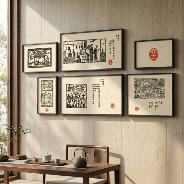 把图中的所有挂画挂在一个中式复古高级室内客厅场景墙上,画质清晰,光影效果