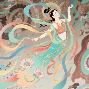 以敦煌文化为灵感源泉,运用国内 AI 技术生成敦煌飞天形象图。生成的图 片需准确提取敦煌壁画中仙女的服饰、姿态、色彩等文化元素,如轻盈飘逸的彩带、精美的裙裾、莲花忍冬纹图案等,同时精准把握敦煌艺术的风格特点,包括 浓郁的宗教色彩、流畅细腻的线条、注重神态和动态刻画、夸张而不失自然的造型等,使图片具有独特的敦煌艺术气质,满足文旅宣传、文创产品开发等领域的 应用需求。
