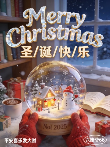 软3D风格圣诞贺图,融合玻璃质感文字与卡通雪人、礼物盒,营造梦幻可爱氛围,传递喜庆节日祝福。