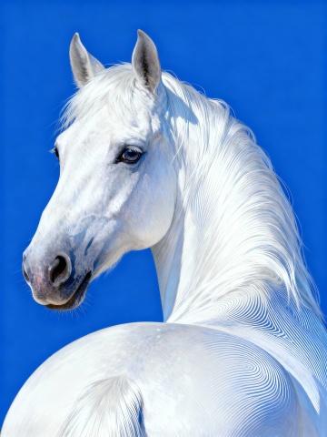 梦幻超现实插画,主体为半侧骏马剪影,鬃毛是彩色飘逸环绕的(橙、黄、绿、粉渐变);场景为干净纯深蓝色背景,点缀蓝紫色抽象线条(具朦胧感);风格融合手绘插画质感与超现实美学,笔触粗犷具艺术感;采用半侧特写构图,主体居右