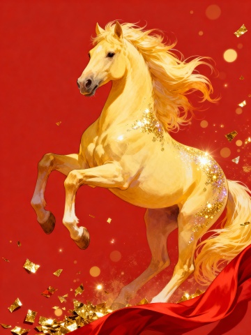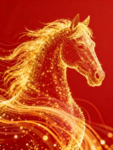 梦幻感与唯美感交织,白描线条勾勒骏马轮廓,粒子风点缀星芒,浮雕质感跃然纸上,插画风呈现优雅意境,暗红底色衬托节日祥瑞之气。
