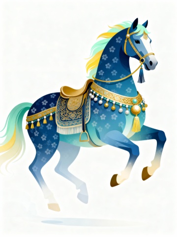 水彩风插画,朦胧梦幻的虚拟自然中,群马悠然游走,色彩交融,营造出静谧神秘的氛围。