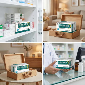 按照原图的包装设计 生成三张不同场景的修正阿莫西林胶囊电商主图,比例1:1