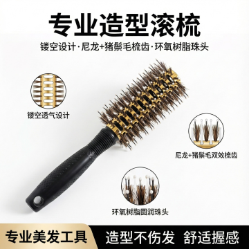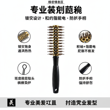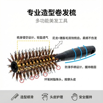 给图中的梳子做一个细节介绍的主图,梳齿的珠头是环氧树脂,梳身有透明效果的ABS材料,梳齿是透明的尼龙 ,背景纯白色,风格简约,保持梳子的形状做说明