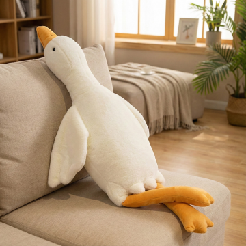 生成一张在一个温馨的客厅图片里的大鹅玩偶趴在沙发上,沙发下有一只拉布拉多幼犬趴在沙发上咬住大鹅玩偶要拽下来