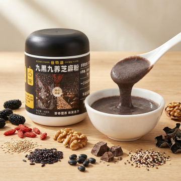主体是桌面上的一个零食桶包装(图2)和一盘装好的坚果酥(图3)。圆桌上面由浅色衬布。盘子周围摆放着一些坚果,如核桃、巴旦木、碧根果、开心果仁等,直观体现原料丰富。背景是虚化的浅色厨房,可以看到绿植。整体风格清新、有食欲,突出产品的天然健康属性。商业摄影,完美画质和构图。