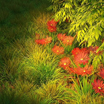 一张展现现代园林景观设计的摄影照片,画面主体为一条由浅色石材铺设而成的宽阔台阶,台阶呈折线形向上延伸,每级台阶边缘嵌有小型圆形地灯。台阶两侧是修剪整齐的绿色灌木和多样化的绿植,形成自然的绿色边界,植物种类包括深绿、浅绿及少量紫红色 foliage,呈现出生机盎然的层次感。整体色调以自然的绿色和石材的暖灰色为主,搭配阳光照射下形成的清晰光影效果,营造出宁静、整洁且富有设计感的氛围。采用高角度俯拍视角,突出台阶的纵深感和几何美感,构图遵循三分法原则,台阶作为视觉引导线贯穿画面中央,两侧绿植形成对称平衡。画面清晰锐利,细节丰富,展现出石材的纹理质感和植物的自然形态,整体风格偏向现代简约的景观设计美学,传递出舒适、有序且亲近自然的空间感受。