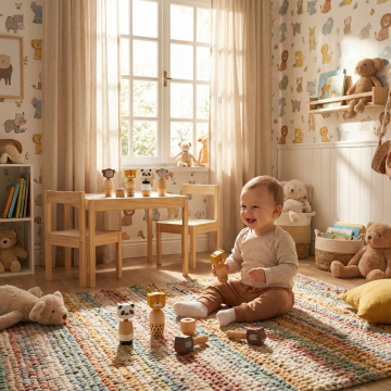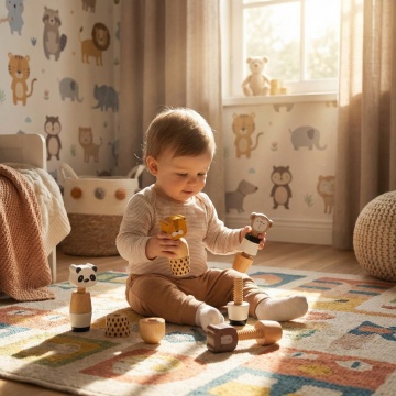 保持产品不变的情况下,帮我生成在室内儿童房的场景,一位外国宝宝正躺在安抚摇椅里伸手跟挂在安抚椅上的产品打招呼,产品只有19CM