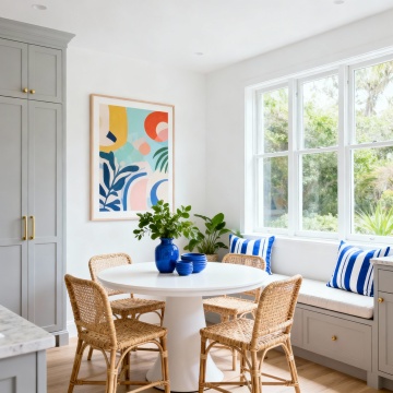现代简约风格庭院设计,浅灰色木质甲板地面中央摆放着圆形混凝土餐桌,桌上有一盘水果,两侧是木质长椅,背景为白色矮墙,墙前种植着多种绿色植物,包括大型观叶植物和低矮灌木,左侧有高大树木,枝叶呈现绿色与橙黄色渐变,右侧有黑色金属框架木质顶棚,地面铺设白色鹅卵石与灰色石板台阶,整体采用自然光线,光影分明,色调以白色、灰色、木色和绿色为主,营造出宁静、舒适、具有高级设计感的户外休闲空间。