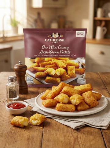 给图1产品生成一张英式餐点场景,产品合理放入,周围摆放着图2一样的薯饼,不出现人物,图片比例3:4