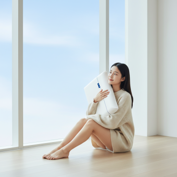 中国年轻女性穿着舒适的睡衣睡裤,赤脚坐在木地板上,怀中搂着参考图产品枕头,身后是巨大的落地窗映出浅蓝色渐变天空。室内光线自然,背景由窗外的淡蓝色渐变到室内的柔白,画面充满呼吸感,风格干净高级,表情放松自然,突出居家舒适与简约美学。图片比例1:1