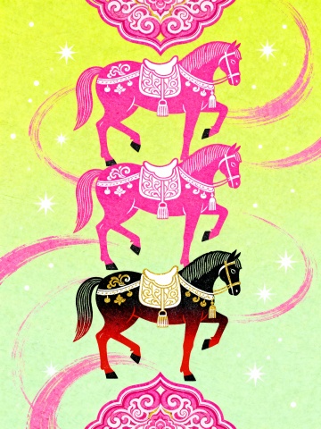 山丹马 世界抽象动物插画大师杰作,表现主义,抽象极简,清水裕子(Yuko Shimizu)的风格,摒弃具体的细节,强调形状和线条的组合,以最简约的形式表现 3只色彩鲜明(黑色、白棕斑点色、蓝色)的奔马的神韵和气质,在欢快地嬉闹。头部线条简洁流畅,与流线型的体型比例完美协调,脖颈上佩戴饰品,展现出一种独特的美感。曲线优美的运动展现出一种与生俱来的优雅与威严。构图简洁,装饰性强,造型优雅,笔触细腻,极度优美简洁之美,令人赏心悦目,马卡龙浅紫纯色背景。高品质细节,超高清分辨率,最佳品质,8K壁纸,