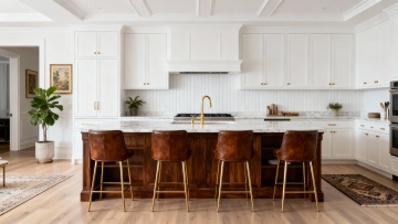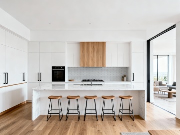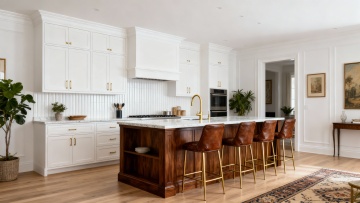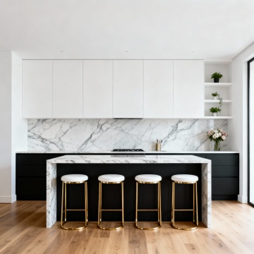 核心布局:以白色 + 黑色 + 木色为主色调,搭配大理石纹理的台面 / 墙面,打造出清爽高级的视觉效果;中央的中岛台既是操作区,也能充当吧台(搭配 4 把鎏金金属框架的白色吧凳)。