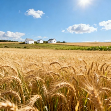 清新水彩风格的丰收主题海报,画面中广阔的金色麦穗田野占据下方60%空间,饱满的麦穗颗粒分明,麦芒清晰可见,随风微微摇曳,洋溢着丰收的喜悦氛围。天空占据上方40%作为留白区域,纯净的浅蓝色背景点缀着几缕柔和的白色云彩,营造出开阔透气的视觉效果。整体色调以温暖的金黄色和清新的蓝色为主,色彩过渡自然柔和,水彩特有的透明质感和细腻晕染效果贯穿画面,笔触轻盈灵动,画面简洁大方,能在短时间内传达出丰收的喜悦与自然的美好。