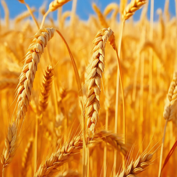 写实摄影风格的田野麦穗自然景观,画面上方50%为纯净的白色留白,下方前景中特写几支饱满成熟的金黄色麦穗,麦芒纤细清晰,麦粒纹理分明,呈现出自然的光泽与质感,背景虚化的麦穗形成渐变的浅金色层次,整体光影柔和,色调温暖,构图简洁大方,突出麦穗的自然形态与田野的宁静氛围。