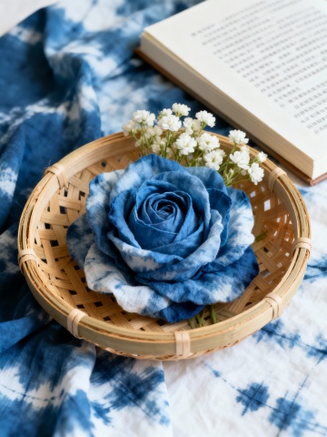 帮我生成6张扎染的图片,要求风格画面多样且写实,整体是蓝白色调,可以是制作扎染的过程图片、成品图片;形式多样的成品,例如裙子、丝巾、包包等,搭配不同的图案;要求整体画面符号当代年轻人的审美潮流,或者充满休闲放松的气息让人有想去体验的冲动;例如,走进扎染工坊,屋内屋顶悬挂着蓝白相间、花纹各异的扎染布,像是为空间披上了艺术的幕布。几张木桌配着长凳,桌上有的铺着扎染布,有的放着待染色的白布,一旁的展示架上,也挂满了精美扎染作品,透着传统工艺的独特魅力。来到屋外,更多扎染布在蓝天映衬下随风轻摆,图案有星星状、不规则晕染等,十分好看。墙面还展示着不同样式的扎染方巾,旁边的木架上,也挂着扎染服饰,处处都能感受到扎染的艺术氛围。竹编小篮里装着用扎染布料做的蓝色“玫瑰”,搭配白色小花,旁边放着本有文字的本子,衬着扎染布,雅致又清新。还有那染缸周围,用扎染布做的花朵、蝴蝶装饰,让整个工坊既充满传统工艺的底蕴,又有着生活的灵动美好。