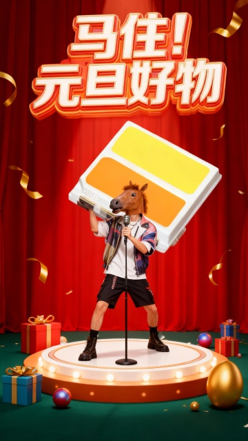 软3D风格拟人马身穿圣诞服饰,手持喇叭与发光礼盒,毛发生长质感细腻,面料纹理生动,喜庆红幕背景烘托节日氛围,卡通感十足。