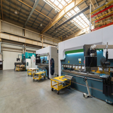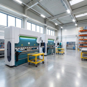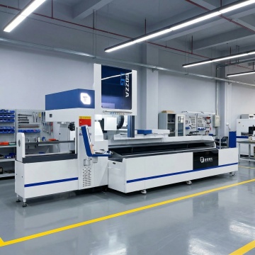 明亮的未来主义风格工厂内部,高科技自动化生产线整齐排列,精密数控机床与机械臂高效运作,身着白色工作服的技术人员在洁净的车间内巡查,柔和的白色与金属银灰色调为主,点缀蓝色科技光效,高天花板上矩阵式LED灯光提供均匀照明,地面光洁如镜反射设备轮廓,整体呈现出高度现代化、秩序井然且充满科技感的先进制造氛围,空间开阔,设备布局科学合理,传达出高效、精准、创新的工业美学。