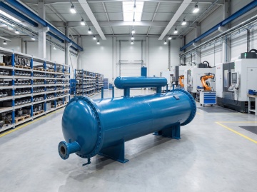 现代化工业场景,蓝色为主色调,清新明亮的光线,干净整洁的生产线,透明玻璃幕墙外是蓝天白云,绿色植物点缀在车间角落,机械臂精准运作,地面反光如镜,整体氛围充满科技感与希望