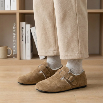 穿搭示意图(知识感融入) 视觉布局:采用“三联画”或左右拼图布局。左侧为鞋子单独摆放,中间为鞋子搭配堆叠的书籍与一个简约的帆布袋,右侧为鞋子搭配一条 hanging 的卡其色风衣或针织披肩。整体色调和谐统一。 文案:底部加一行小字:“为安静的探索与日常的漫步”。