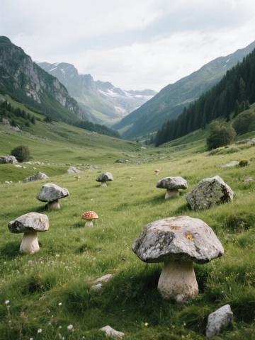 超写实摄影风格,俯视角微距镜头下的晨雾弥漫古老森林地表,画面以清新柔和的浅绿色渐变背景为主,营造宁静自然的氛围。前景是覆盖着绒毯般鲜绿苔藓的地面,苔藓呈现出细腻的纹理和饱满的质感,其间点缀着半透明的蕨类嫩芽和三朵顶戴珍珠晨露的白色小蘑菇,中央位置一块布满深绿苔藓的不规则灰黑色岩石被细密的银灰色菌丝网络温柔托举,岩石表面镶嵌着几粒折射彩虹光晕的露珠,边缘略显粗糙,整体形态自然质朴。构图采用近景特写,主体明确,景深控制得当,背景是逐渐虚化的深绿蕨类植物墙,空气中悬浮着肉眼可见的微小水汽颗粒,光线柔和均匀,从上方树冠缝隙中投下柔和晨光,在苔藓和岩石表面形成斑驳的金色光斑与微妙的光影变化,高光处露珠闪闪发光,阴影部分自然柔和,整体色调是多层次翡翠绿与苔藓灰的和谐交融,传达出清新、静谧、充满生机的自然之美。