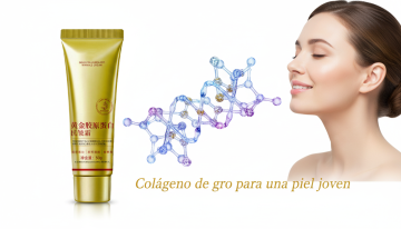 以图中的黄金胶原蛋白抗皱霜为元素,欧美女人使用黄金胶原蛋白抗皱霜护肤,减少皱纹,抗衰老,物体主体特征不变,设计6张跟黄金胶原蛋白抗皱霜有关的图,可以加一些西班牙语文案装饰一下,比例 「16:9」