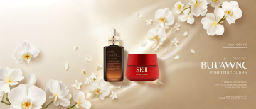 鎏金与红白双色设计,融合玻璃质感瓶身与分子结构,科技感十足,展现奢华商务风,突出抗皱功效。