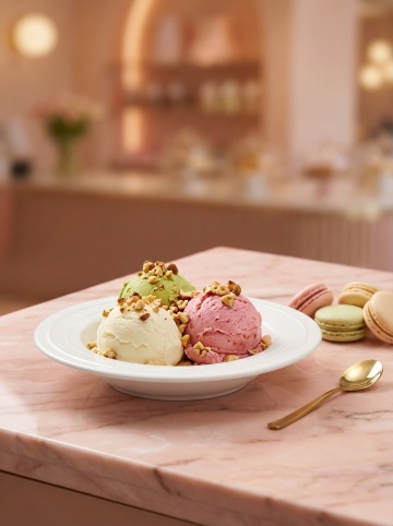 色彩鲜艳的写实风格冰淇淋球组合,透明雕花玻璃高脚杯盛放,三个不同口味的冰淇淋球堆叠:深棕色巧克力口味带细腻波纹,白色香草口味点缀黑色巧克力碎,浅棕色香草口味顶部装饰黑色几何图案巧克力片,右侧有螺旋状奶油,杯壁内侧底部有彩色水果丁(红色樱桃、黄色芒果块),两根棕色酥脆蛋筒斜插在冰淇淋球后方,整体光影明亮柔和,高光突出冰淇淋的丝滑质感和玻璃的透明光泽,色彩饱和度高且对比鲜明,构图饱满居中,背景为纯白色。