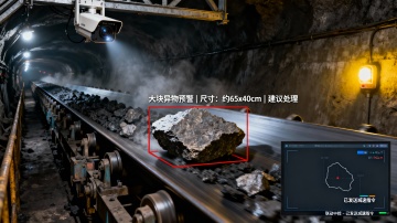 AI摄像机展现了强大的环境适应性:尽管光线昏暗且有粉尘干扰,图像经过增强处理,异物细节清晰可辨。整体氛围在机械的持续轰鸣中因突发预警而瞬间紧张,但响应流程井然有序。科技感克制地体现在精准的实时识别、分类标签与无缝的远程联动上。风格为高度写实的煤矿井下场景,强调这套AI系统如何作为“全天候的视觉哨兵”,在复杂恶劣的环境中,将随机、危险的异物入侵事件转化为可即时预警、分类并追溯的安防信号,筑牢生产稳定的防线。
