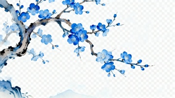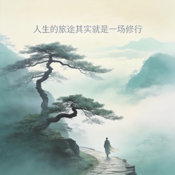 水墨风插画,青绿山水间松下打坐,虚实相生,营造清透柔和的虚拟自然意境。禅意,冥想