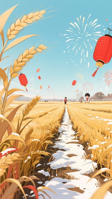 插画风融合国潮与水彩,烟火映雪夜,祖孙共庆新春,红灯笼与“福”字传递喜庆温馨,故事感十足。
