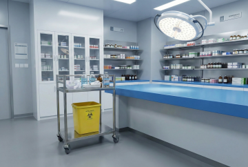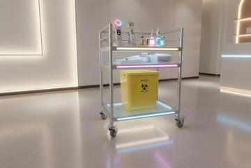 参照以上图片的版式设计,并生成以下描述的图片:极简主义导向系统设计,指示牌整体采用垂直对称构图,长方形白色标牌与下方U形金属支架形成稳定的视觉平衡,"医务人员"四个汉字采用居中对齐方式,字符间距精确控制在1.5字符宽度,红色文字区域占白色标牌面积的35%,底部U形支架宽度与顶部标牌宽度比例为1.6:1,四个圆形橡胶防滑垫呈等距矩形排列,整体符合人体工程学视觉识别高度