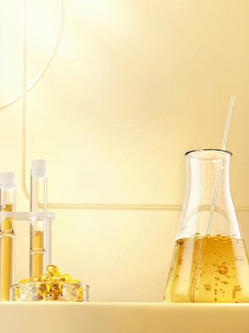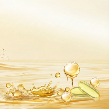 一张具有高度写实风格的背景图,画面主体是流动的金色透明液体,呈现出优美的波浪形态,液体中包裹着一个较大的透明球体,球体内有精致的分子结构图案和多个小气泡,周围散落着大小不一的透明气泡,整体色调以柔和的金色和米白色为主,光线明亮且柔和,光源来自画面上方,形成自然的高光和细腻的阴影,营造出纯净、奢华且富有科技感的氛围,液体质感光滑且具有高度的透明感和流动性,构图采用中心聚焦式,主体元素位于画面中央,四周留有适当留白,增强整体的轻盈感和空间感。