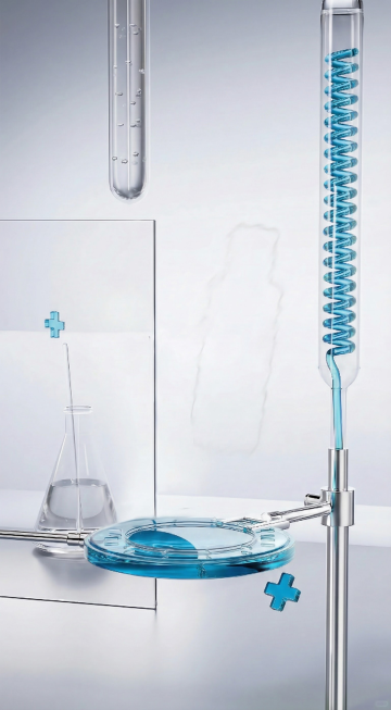 3D渲染风格的护肤品精华液广告海报,画面整体变换为以清新的蓝色调为主,搭配透明的水感白色,营造纯净科技的氛围。中央是一个透明的球形精华液胶囊,内部可见清晰的分子结构和悬浮的小气泡,周围环绕着流畅规整的液体波浪线条,波浪呈对称的弧形排布,大小不一的透明气泡均匀分布在画面中,整体构图平衡有序,光影柔和,高光表现细腻,液体质感通透富有光泽,视觉层级清晰,突出产品的科技感与纯净特质,信息传达高效,符合高端护肤品的目标受众审美。