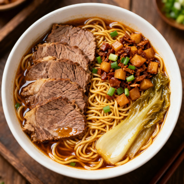 顶视角度,一碗黑色的碗里装着飘香的牛肉面,面条根根分明,汤色浓郁,上面撒着鲜红的辣椒和翠绿的葱花,热气腾腾,散发着诱人的香气,画面清晰,色彩鲜艳,细节丰富