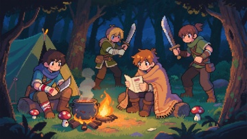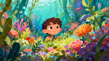 清新插画风,卡通人物与狗狗拟人化探险,背景雪山湖景,充满自然生机。