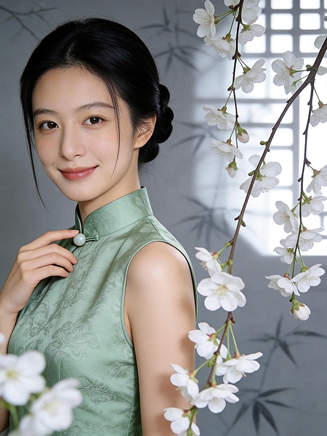 参考图保留人物脸型、发型、年龄特征,生成宋韵“海棠春”主题清冷温婉风写真,以文人画意境为内核,融合传统宋锦旗袍与垂丝海棠元素,传递东方雅致娴静的美学氛围; 人物主体(保留参考图年龄脸型),中式偏分低盘发/束发(发丝梳理得服帖整齐,鬓角刻意留三缕细碎发丝修饰脸型,如宋画仕女鬓边柔丝),宋制“素面妆”(细弯远山眉,无眼影仅以淡墨勾勒眼尾,唇敷胭脂水似桃花初蕊,面若凝脂,肌理细腻无妆感,自带清冷通透感),气质如深闺仕女,清冷中含温婉; 环境与构图:背景为烟灰色仿宣纸质感墙面,表面隐现浅淡墨竹暗纹,前景与中景穿插素白垂丝海棠花枝(花枝疏朗,花瓣圆润如凝脂,嫩绿叶脉清晰,自然搭配于人物肩侧,大师级构图极致中式美学,如文人画中“折枝海棠”构图),近景取景(覆盖头部至肩部,聚焦面部神态与旗袍立领细节),三分构图(人物居左侧1/3区域,海棠花枝延伸至右侧1/3形成视觉平衡,留白处尽显宋画“计白当黑”美学)留白空间感,平拍视角(镜头高度与人物下颌线平齐,如近距离观仕女图,增强沉浸式氛围感); 光影与色彩:打光为仿中式花窗自然光(模拟从木质雕花格窗透入的柔和天光,从前方45°洒落),色温5000K自然色调,面部光影过渡细腻无硬阴影,似宣纸晕染般柔和;色调为低饱和豆绿(宋瓷天青色衍生色,旗袍主色)+素白(海棠)+烟灰(背景),低对比度,色彩清雅和谐,完全贴合宋画“淡彩设色”体系; 细节补充:服饰为豆绿宋锦提花改良旗袍(无袖立领设计,领口搭配精致和田玉素面小盘扣,面料暗纹为传统缠枝竹梅纹,哑光宋锦肌理自带复古质感,垂坠感柔和);动作是左手纤指轻触立领精致扣,腕间自然弯曲的弧度复刻宋画仕女姿态,身体微侧、肩部放松;表情为眼神澄澈直视镜头,似凝视落花,唇色自然微润,气质清冷温婉,如“海棠春睡”般优雅娴静;氛围为宋画柔焦滤镜(曝光+3,饱和度5,背景花枝轻度虚化如淡墨晕开,前景海棠花瓣边缘保留清晰纹理); 画质参数:超高清4K分辨率,中度锐化(清晰呈现宋锦提花暗纹、发丝梳篦痕迹与海棠花枝脉络),纯净无噪点,画面质感如宋代绢本仕女图般细腻柔和,自带复古哑光肌理。详情