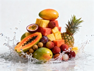 高清晰商业产品摄影风格,纯白背景,六款不同样式的新鲜水果整齐排列,包含完整与切开的黄色百香果(展现内部橙黄色籽囊与白色果瓤)、新鲜青柠、红草莓、紫葡萄、绿猕猴桃、黄柠檬,每个水果表面带有自然光泽与晶莹水珠,搭配翠绿新鲜的叶片与藤蔓点缀,光线从斜上方均匀照射形成柔和阴影,色彩鲜艳饱和,细节纹理清晰可见,构图对称平衡,画面干净通透,突出水果的新鲜感与质感。
