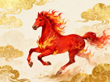 一匹姿态昂扬的骏马,身披红色绸缎,鬃毛和尾巴飘逸,马蹄踏在金色祥云上,周围环绕着红灯笼、中国结和金色烟花,背景是淡红色渐变,整体风格喜庆吉祥,充满新年氛围