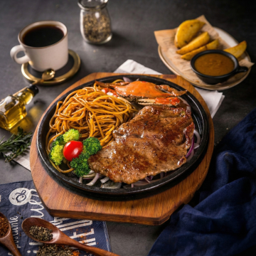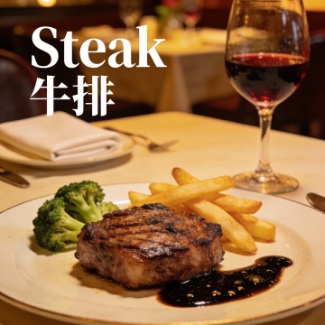 复古油画风与木雕质感结合,实景光影下呈现质朴粗犷的牛排,佐以迷迭香与粗盐,尽显节日盛宴的温暖氛围。