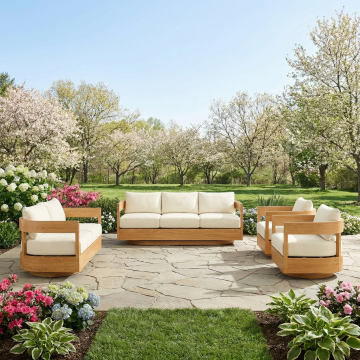 帮我生成图片:将图1主体储物箱位于门廊,储物箱中放置抱枕,有木围栏,可以看到入户门,周围有一些盆栽装饰,不变形,储物箱放置在图中右侧,美式风格,明亮光线,突出产品质感,精细,高清,8k,4张图
