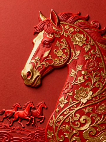 水墨风与鎏金风交融,工笔勾勒骏马腾跃之势,古典山水背景衬托出中式唯美感与热血励志气息,尽显优雅文艺之韵。