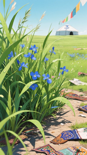 二次元,草原,细节丰富,绿色和蓝色,民族风,生成2张,不要人,4k,9:16