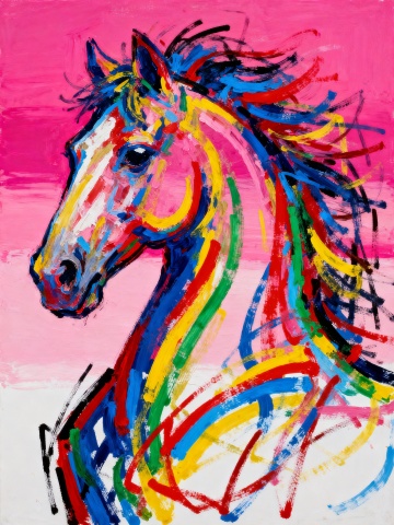 水彩风插画,朦胧梦幻的虚拟自然中,群马悠然游走,色彩交融,营造出静谧神秘的氛围。