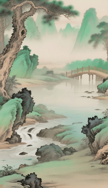 中式古典梦幻,工笔风虚拟自然,水墨意境山水画卷。