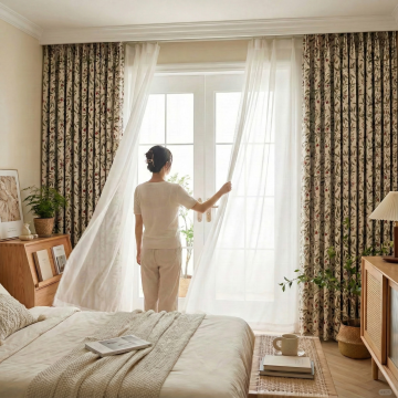将图二图三的窗帘放置于图一的法式奶油风卧室场景中,删除所有文字,窗帘为米色底绿叶红果印花样式,整体温馨浪漫,尺寸1:1比例。