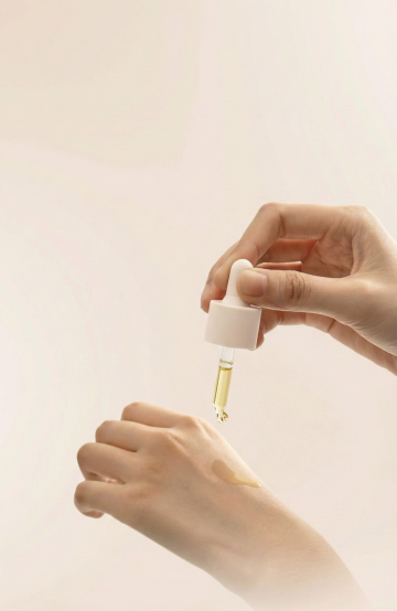 产品为主体,摆放白色石块做层次,把产品放在石块上,周围摆放白花,点缀绿色植物。