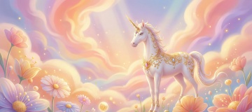 梦幻水彩风插画,鎏金装饰独角兽立于花海云间,轻拟物自然元素交织,唯美感与甜蜜浪漫氛围弥漫,宛如童话梦境。