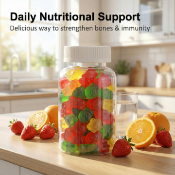 一张现代简约风格的保健品海报,主色调为清新活力的橙色与白色渐变,背景采用柔和的流线型光晕设计,营造出轻盈通透的氛围。画面中央偏右位置放置一个白色为主、橙色波浪条纹装饰的保健品罐子,罐子上印有醒目的橙色“GAODING”品牌名称。罐子周围点缀着悬浮的透明玻璃质感气泡,增强科技感与纯净感。左侧以垂直排列的橙色六边形信息框呈现产品核心卖点,包括“维生素含量高达90%”、“天然植物萃取”、“易吸收配方”、“无蔗糖无添加”等文字内容。海报顶部中央位置为品牌名称“DANBAIFEN”,其下方是大号加粗的核心宣传语“补充维生素活力”,整体视觉层次分明,信息传达高效,符合健康保健产品的专业形象与清新调性。